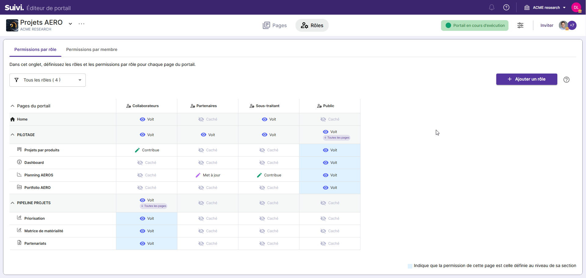 Rôles système (Administrateur, Administrateur client, Contributeur, Visiteur) pour concevoir / administrer le portail